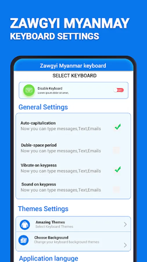 ★ Turn On/Off Roman Zawgyi Myanmar (native)in English Keyboard. Just Turn Fast Zawgyi Myanmar typing option On to write in Zawgyi Myanmar using English Keyboard