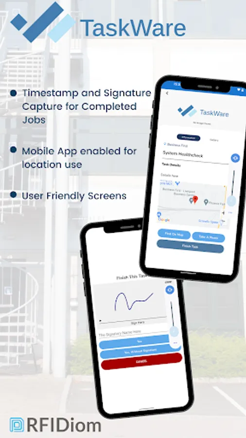 The mobile app is enabled for location use and has functions for both timestamp and signature capture.