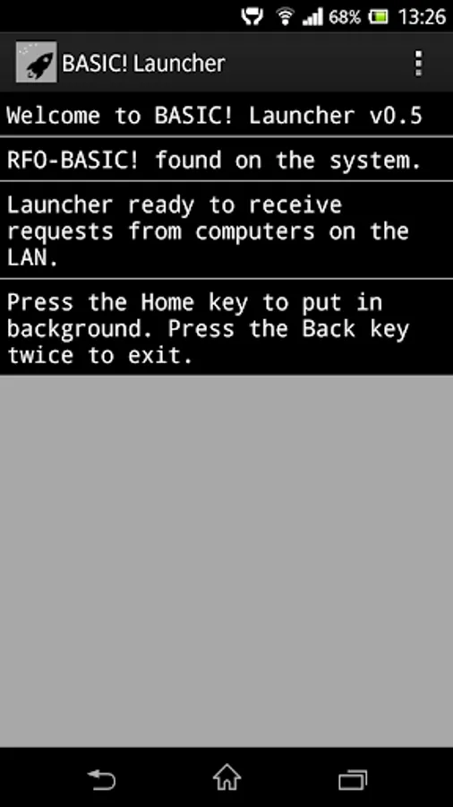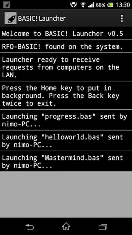 After download, run the BASIC! Launcher (WiFi) on your Android device and hit the Home key to send it to the background. The app will intercept transfers from your computer and launch the incoming program. No additional configuration needed; as long as computer and phone are on the same LAN they autodetect each other.