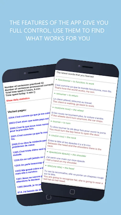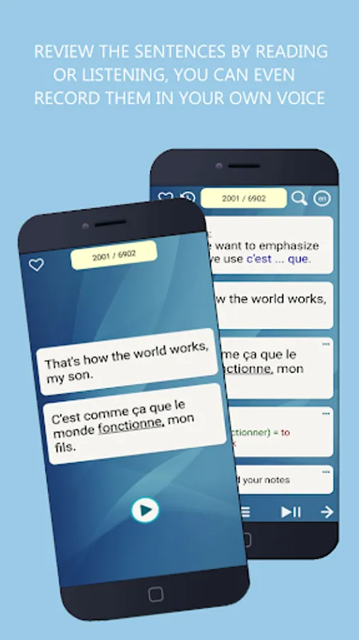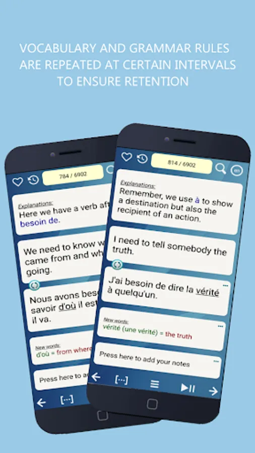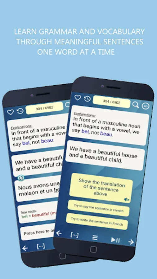 The app uses your brain's natural ability to learn languages by the repetition of relevant patterns specific to the French language.