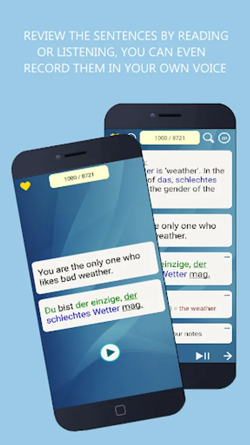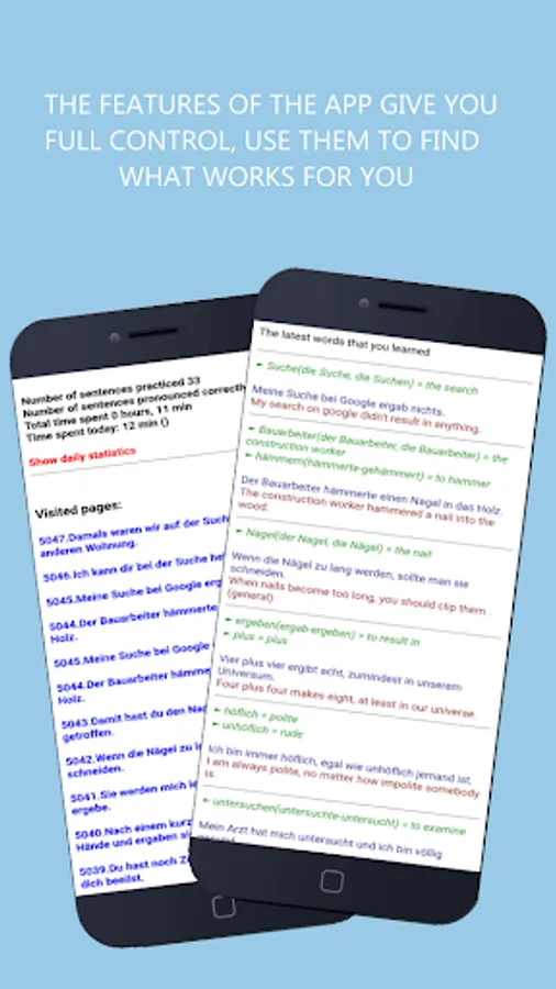 The app uses your brain's natural ability to learn languages by the repetition of relevant patterns specific to the German language.