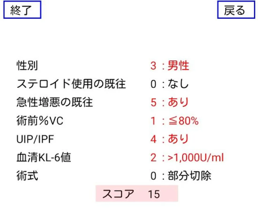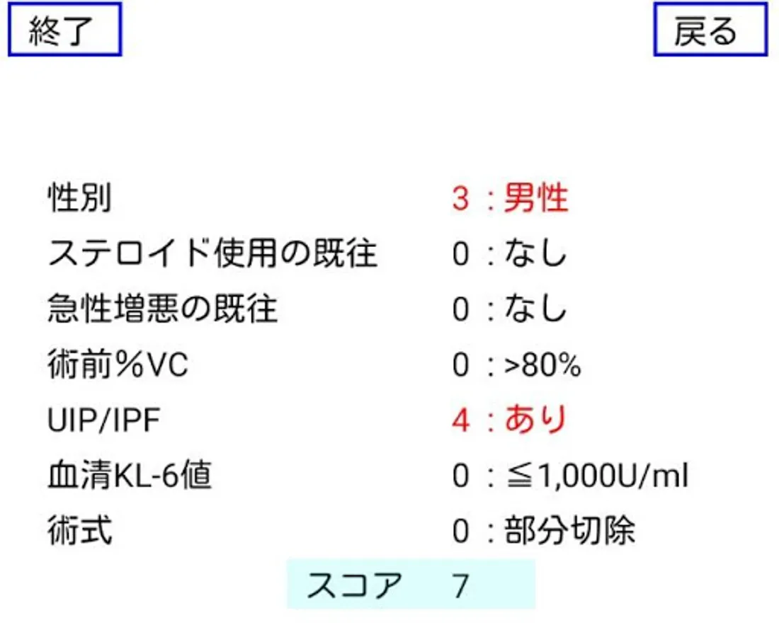 The risk score, body surface area, lung age, and estimated vital capacity of acute exacerbation of postoperative interstitial pneumonia are obtained.