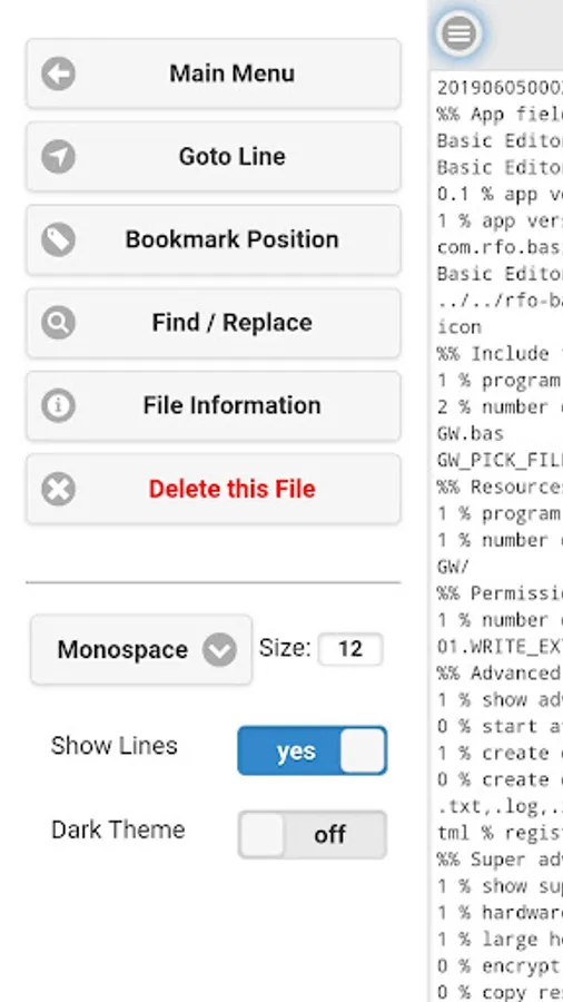Basic Editor natively supports light & dark modes, line grid, different font size and type (monospace, serif, sans-serif) and the usual features of your basic editors: goto line, find & replace, file information etc.