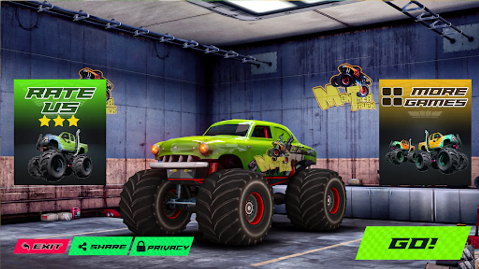 Try crazy Monster trucks racing tracks and all monster trucks in the garage.