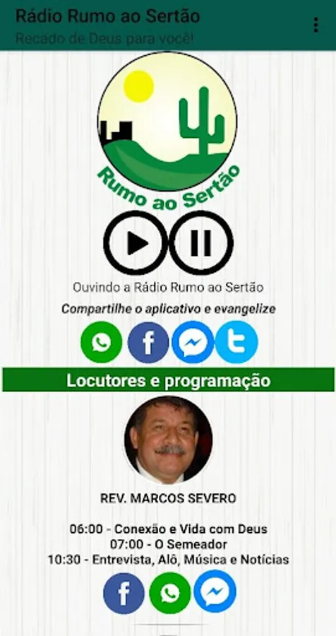 This is the official app of Radio Towards the Sertão. Check out program schedules, announcers, links to communicate with announcers and can share the app to evangelize your friends and family. Download and listen to the most heard gospel radio in Rio Grande do Norte and one of the most in Brazil, Radio Towards the Sertão, announcing the gospel to the world!