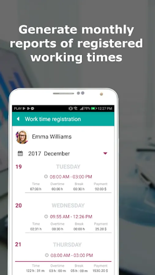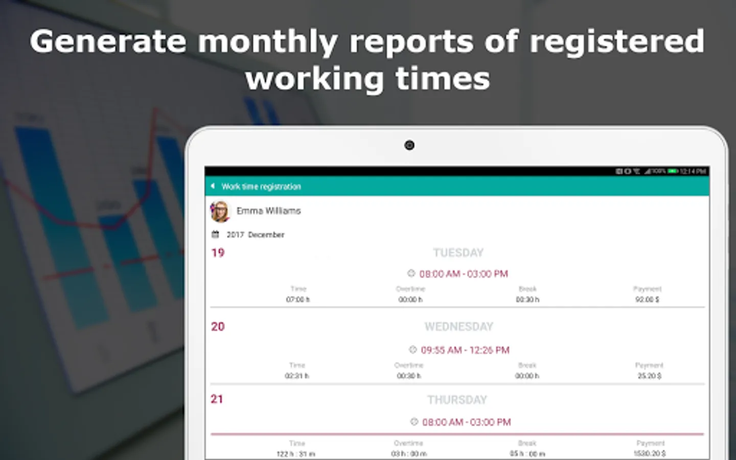 You can use Smartphone or Tablet as a Work Time Recorder, leaving it with the application running at the entrance to the workplace. Communication between devices is carried out using the NFC module. An employee will have to bring his phone close to the device in order to start or end his work time.