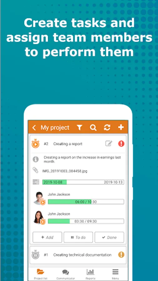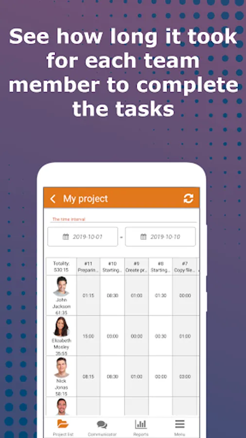 You will be able to create tasks and assign people to perform them. People who join the project will see the tasks created and will be able to record the start and end time of the selected task. At any time you will be able to see who is working on what task and how much time it took to complete the task.