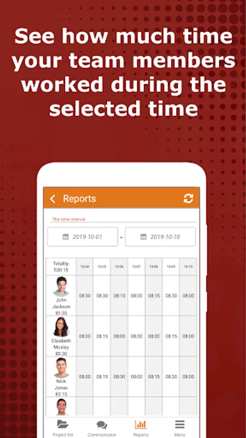 - displaying the number of hours worked by individual team members in the selected period of time,