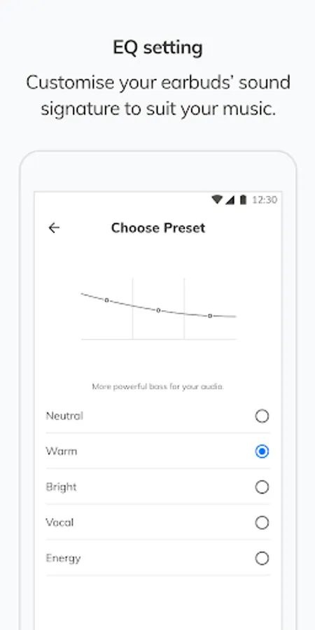 Choose one of RHA's signature EQ settings to boost, tune or mellow your music.