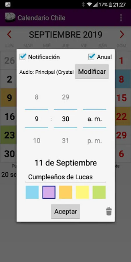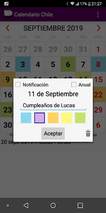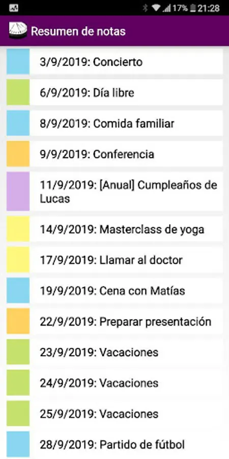 - ANNUAL NOTES. Indicate birthdays, anniversaries... and with this option they will be repeated automatically every year. As in the case of the daily ones, they are identifiable notes by means of a background color, and you can modify them, delete them, or even transform them into a daily note later.