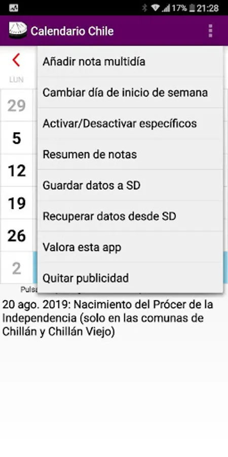 - ACTIVATE/DISABLE SPECIFIC. Activate or deactivate specific holidays in Chile (days marked in green) according to your preference, so that the calendar does not show them automatically.
