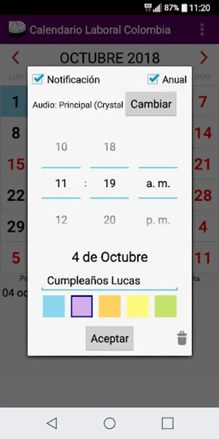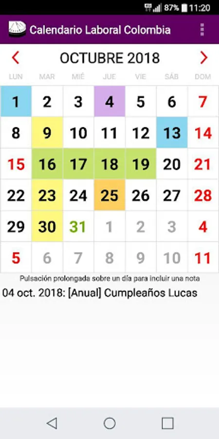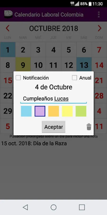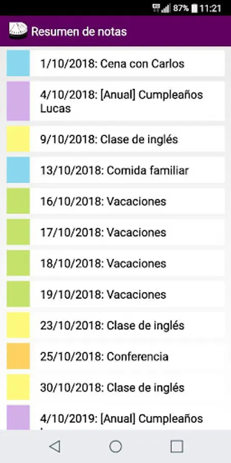 - ANNUAL NOTES. Indicate birthdays, anniversaries... and with this option they will be repeated automatically every year. As in the case of the daily ones, they are identifiable notes by means of a background color, and you can modify them, delete them, or even transform them into a daily note later.
