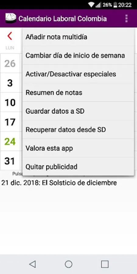 - ACTIVATE/DISABLE SPECIAL DATES. Activate or deactivate the special dates in Colombia (days indicated in green) according to your preference, so that they are not displayed automatically.