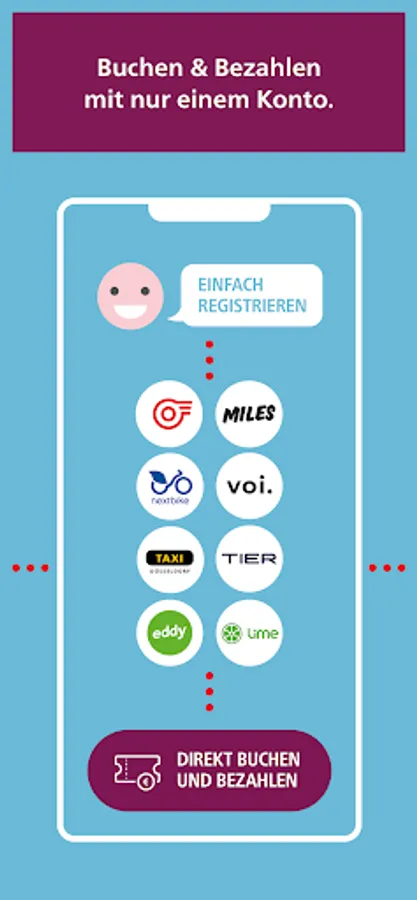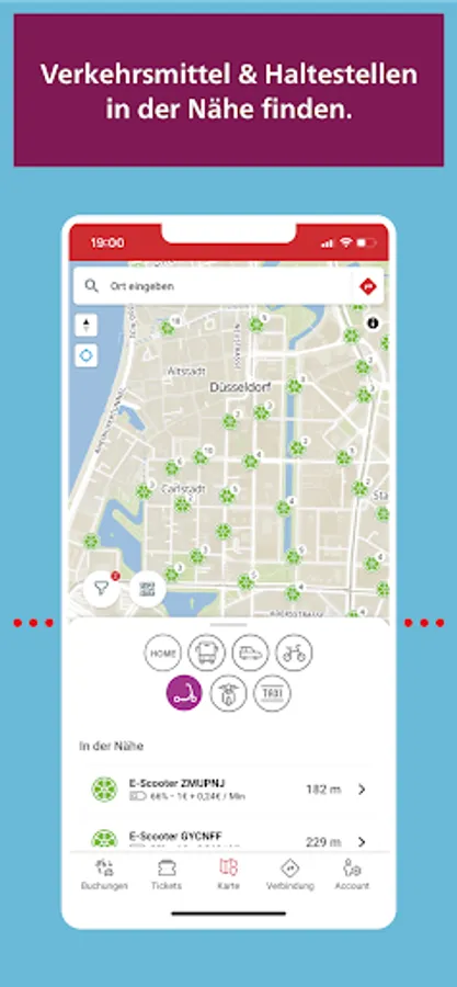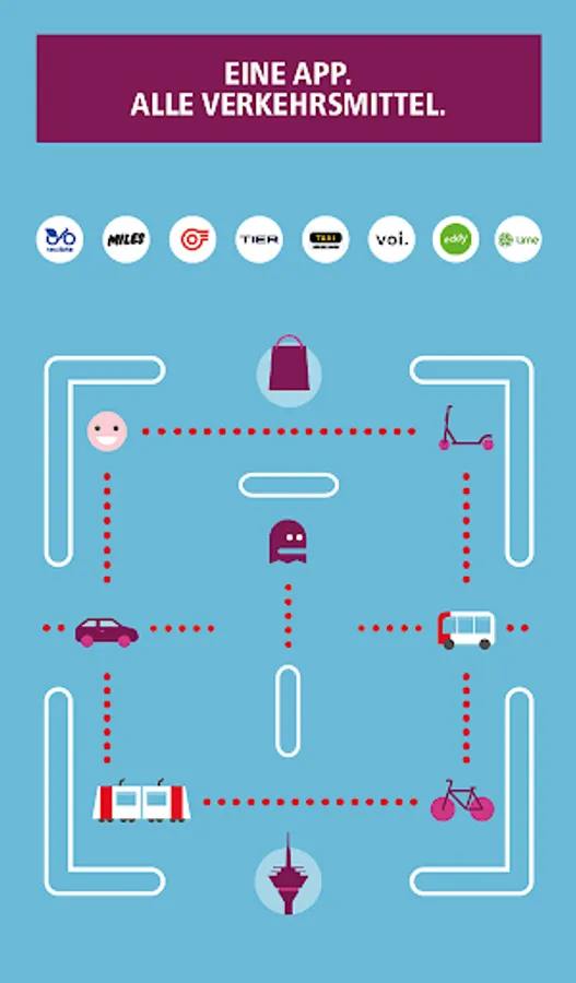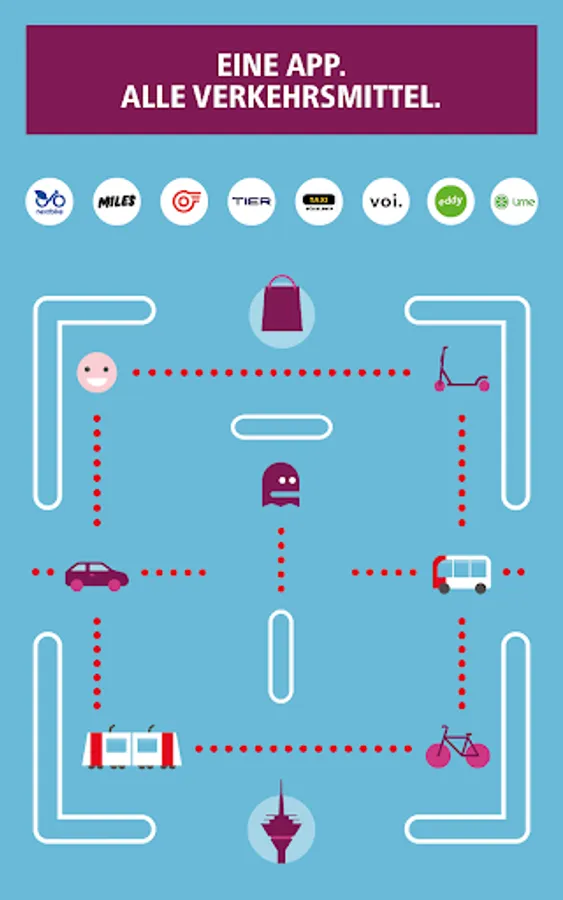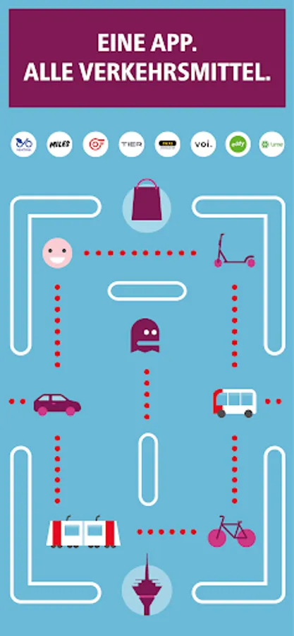 In addition to the buses and trains of the Rheinbahn, there are: MILES, nextbike, TIER, Voi, eddy. Lime and TAXI Dusseldorf. Further mobility service providers will supplement the offer in the future.