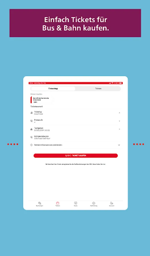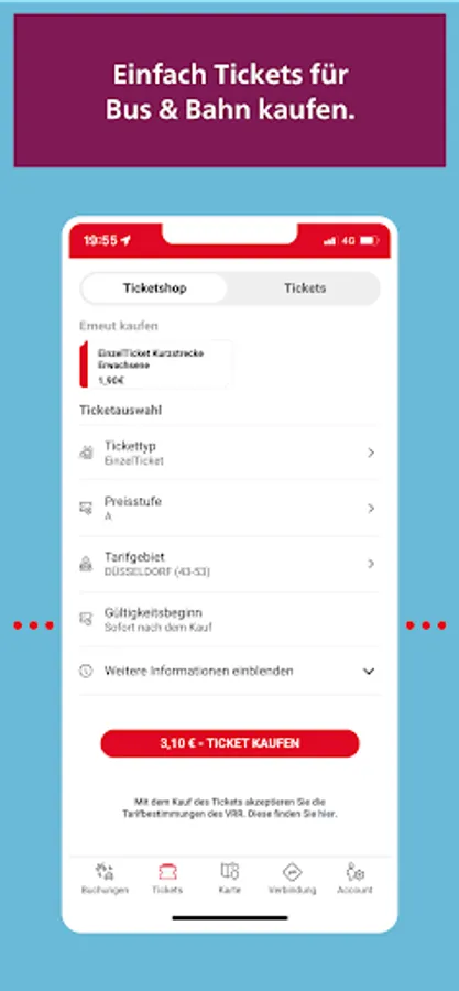 Ticket purchase for bus and train: Single ticket, 4-ticket, 10-ticket, 24-hour ticket, 48-hour ticket, HappyHourTicket. The tickets are available in price levels A, B, C and D and can therefore be used in the entire area of the Verkehrsverbund Rhein-Ruhr (VRR).