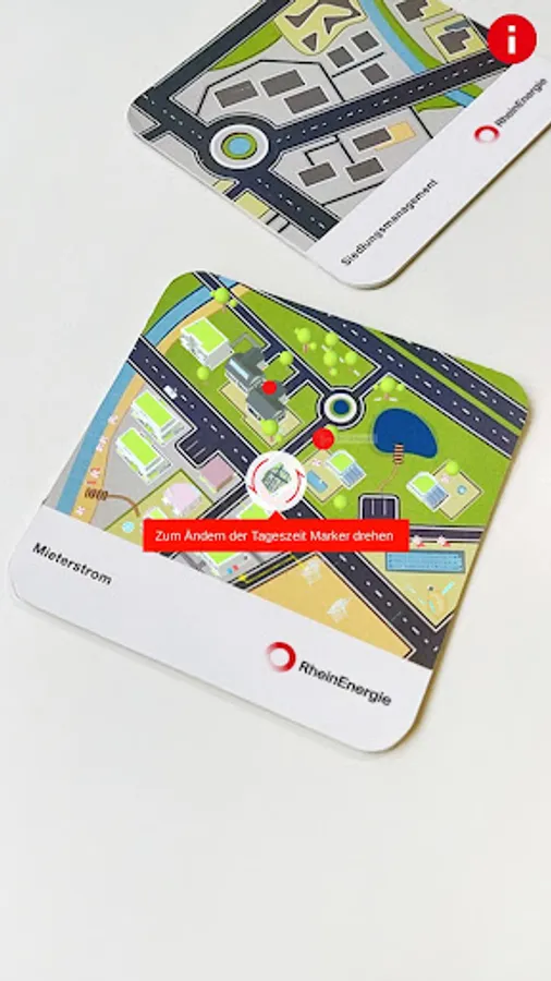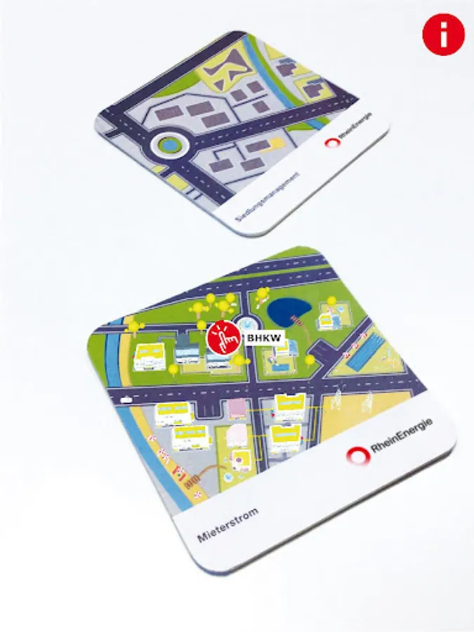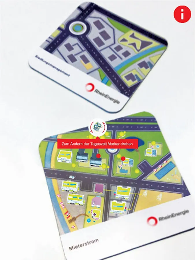 The app AR RheinEnergie turns our products into three-dimensional, visually tangible content. By scanning the subject areas on the associated beer mats, DIN A5 cards or the highlight exhibit on our exhibition stand, the world of RheinEnergie opens up on the mobile device.