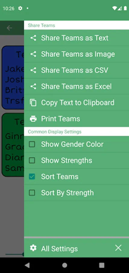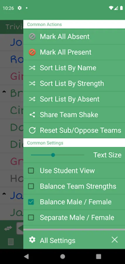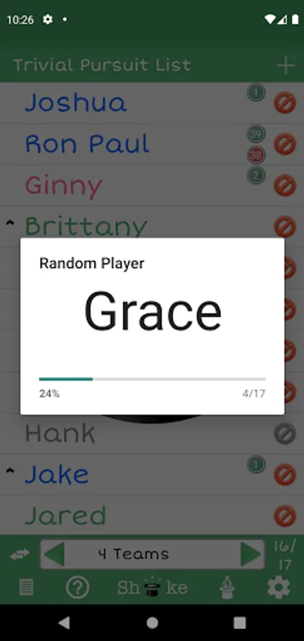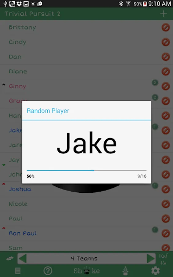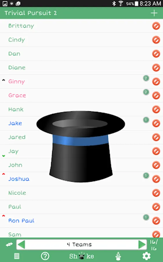 Team Shake is the premier Android app for creating teams. Instead of a hat and scraps of paper, the user enters his friends' names in his phone or tablet and gives it a shake. The screen will then display a random set of color-coded teams. These teams can immediately be used for game play or shared via facebook or email. The quick and easy selection of random (or balanced) teams eliminates fighting over who will be on which team. Innovative use of the shake gesture gives users the satisfying feeling of shaking a virtual hat without the trouble of carrying around an actual hat. Conventional buttons can also be used for those who would rather not shake their expensive hardware about.