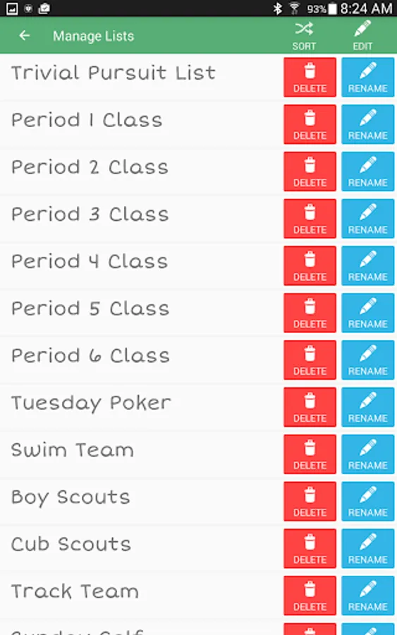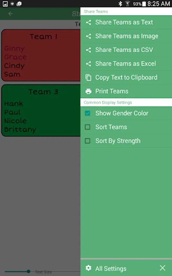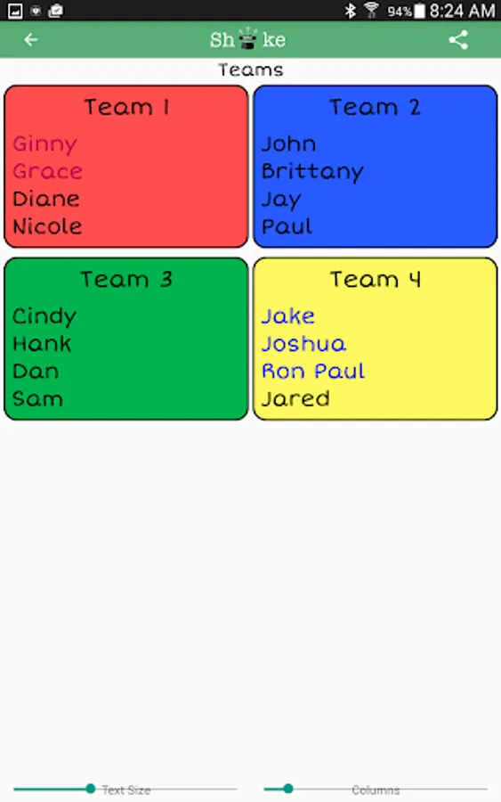 The app is designed with ease of use and simplicity in mind. Names can easily be entered with the onscreen keyboard, or imported from a file. The email / Facebook / Twitter sharing function document the members of each individual team as well as preserving the team number and color assigned by the app. For repeated use of Team Shake, lists of friends can be easily saved and loaded later. The current list is also automatically saved so that if you exit the app, or even reboot the device, changes will not be lost. For teachers and others with large lists of people, Team Shake supports the ability to import teams from text files, CSV files, or Excel spreadsheets.
