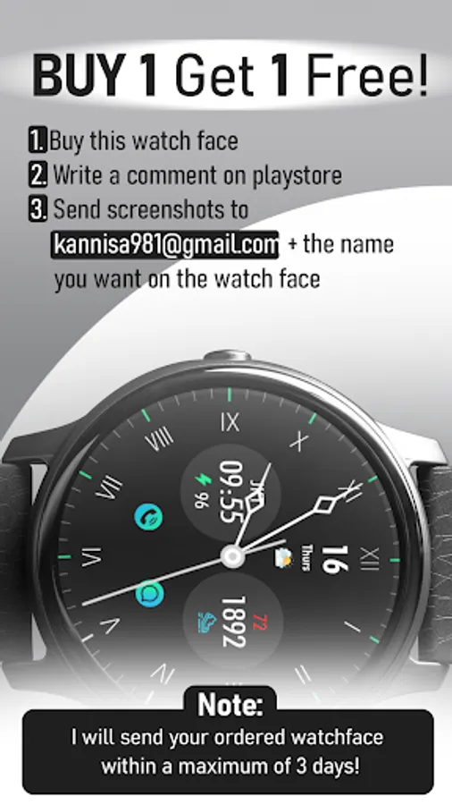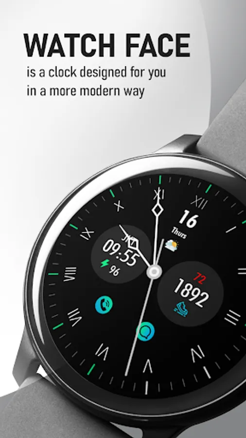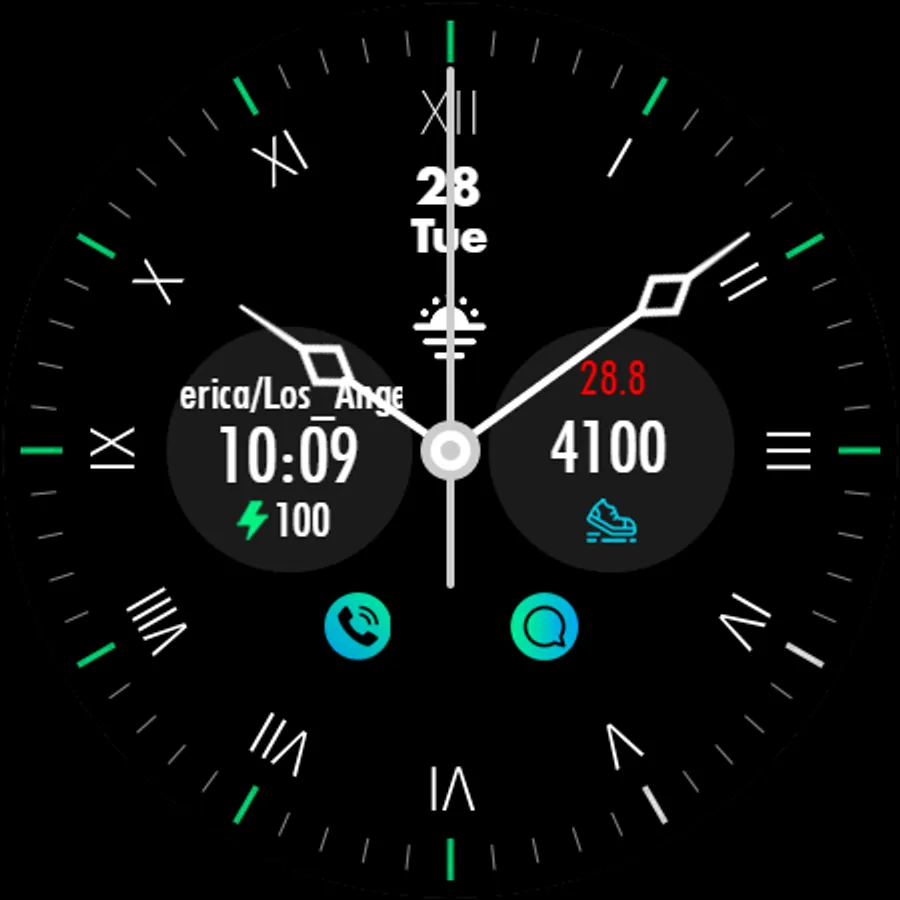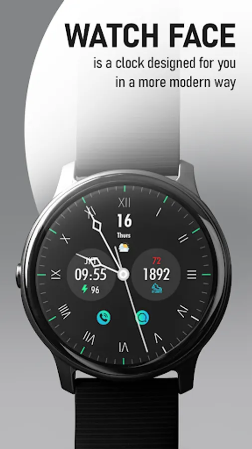 Black Analog watch face Analog Watch Face Wear OS Analog Watch Face displays a simple index with location, weather, day, date, battery, call and chat notification display and most importantly a pedometer for sports or everyday use, but the wear os function is already present in general, what distinguishes it is its unique design with its mix of Roman numerals.