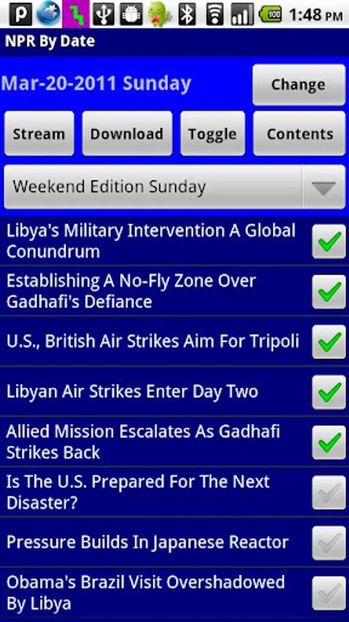Stream or podcast NPR programs by date. Stream via a built in player or podcast (download) and play with your favorite audio player. Comments and questions to sadsaddle@gmail.com