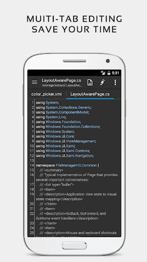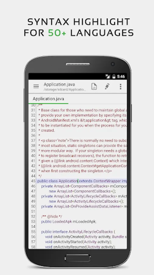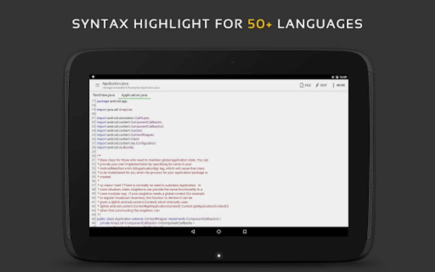 ✓ Code editor and syntax highlight for 50+ languages (C++, C#, Java, XML, Javascript, Markdown, PHP, Perl, Python, Ruby, Smali, Swift, etc).