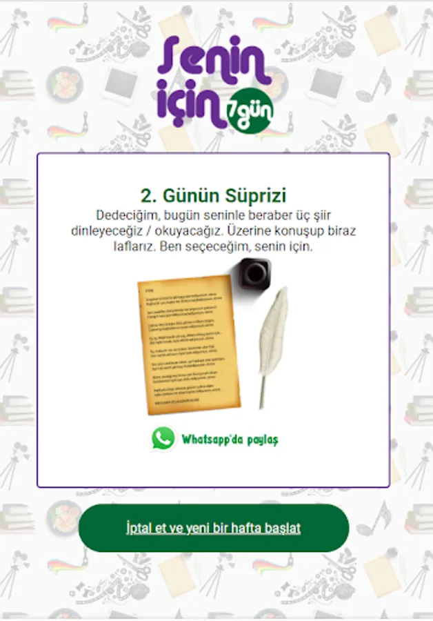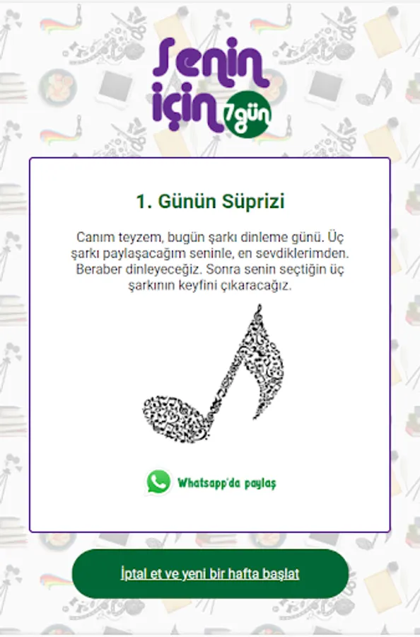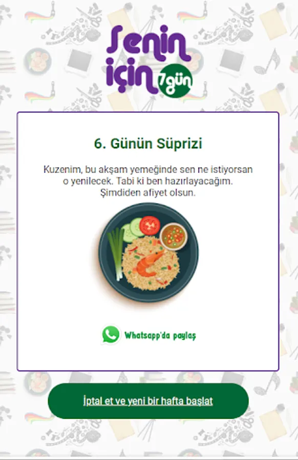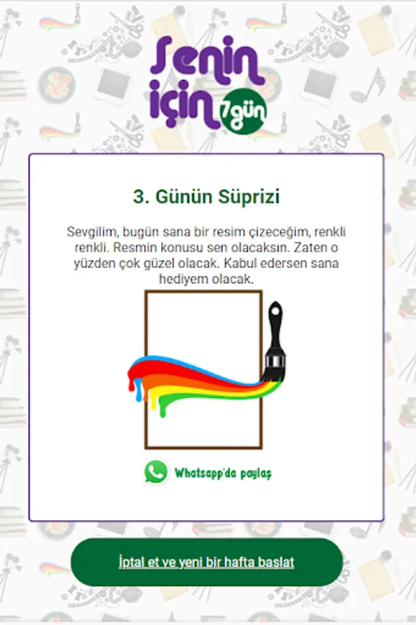 There is only one thing you need to know. You will choose 7 surprises and you will make one happen every day. But only one detail; This application will determine which surprise you will present on which day, not you.