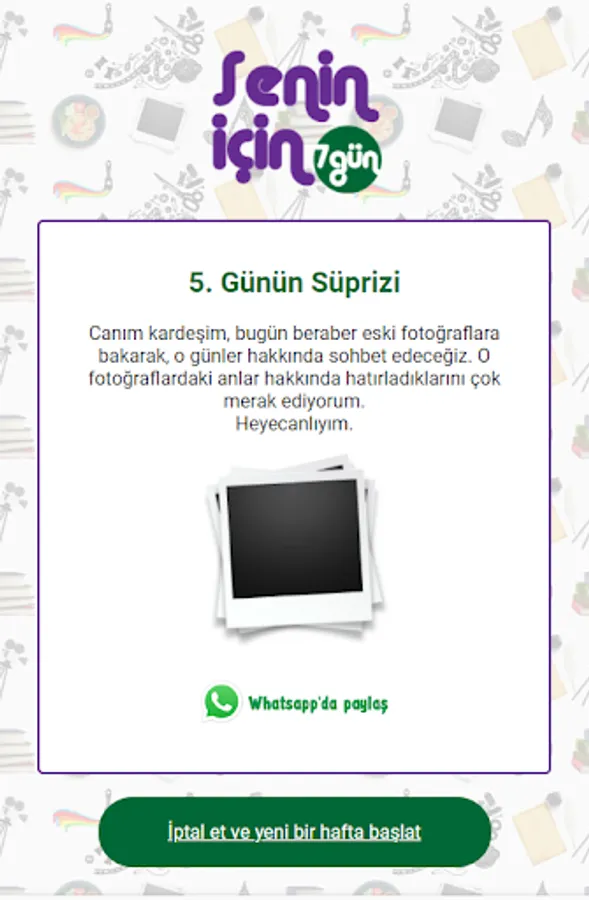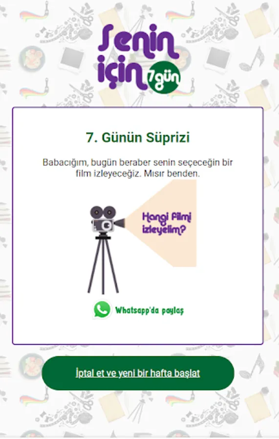 For seven days, you will present surprises to make whoever you choose happy. You choose what these surprises will be. By choosing 7 surprises from nearly 100 options, you will have fun with the person you want to make happy. Unforgettable memories will be collected.