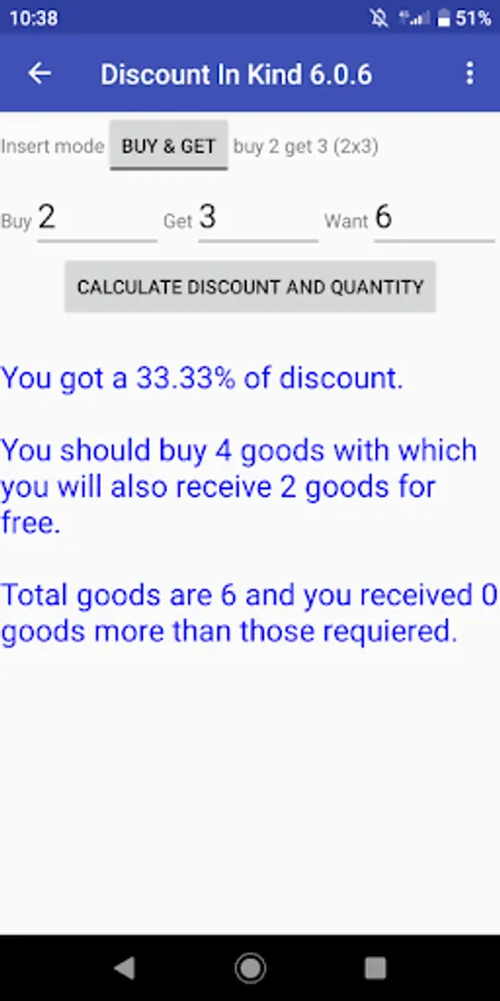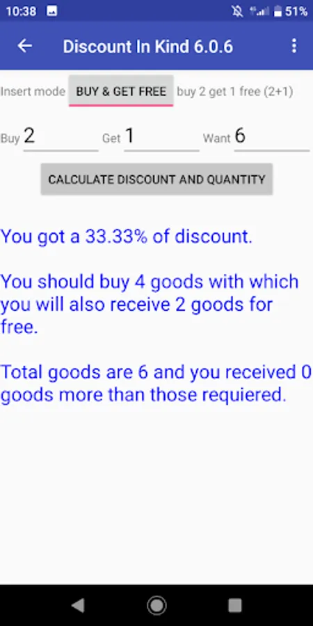 With this application you can easily and quickly calculate the discount in goods and the quantity of goods to order. The app offers two ways of calculating discounts: 2x3 or 2+1.You can also perform any percentage calculation operations such as add, subtract and split percentage, total calculation from discounts and percentage.