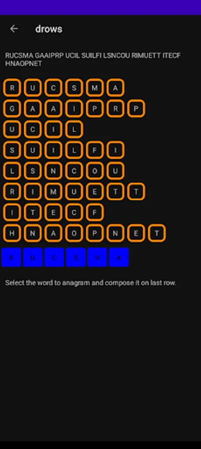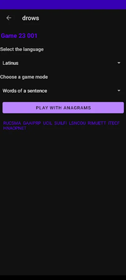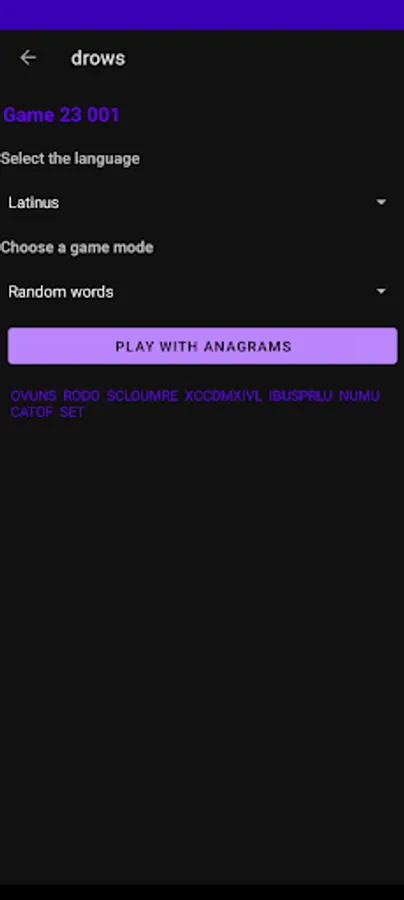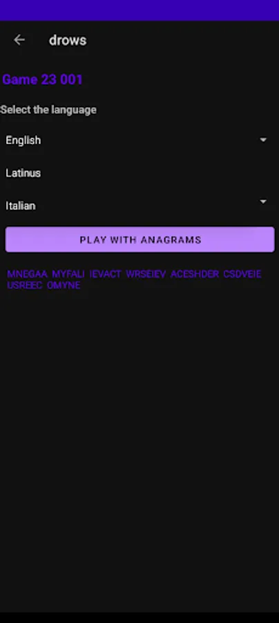 You can choose between three anagram languages (the words to compose can be in English, Latin or Italian) and even if the words are put together at random or if they form a real sentence.