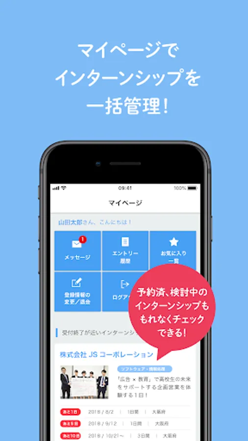 Register your favorite internships, manage your entry history, manage messages from your company, etc., and manage them all on My Page.