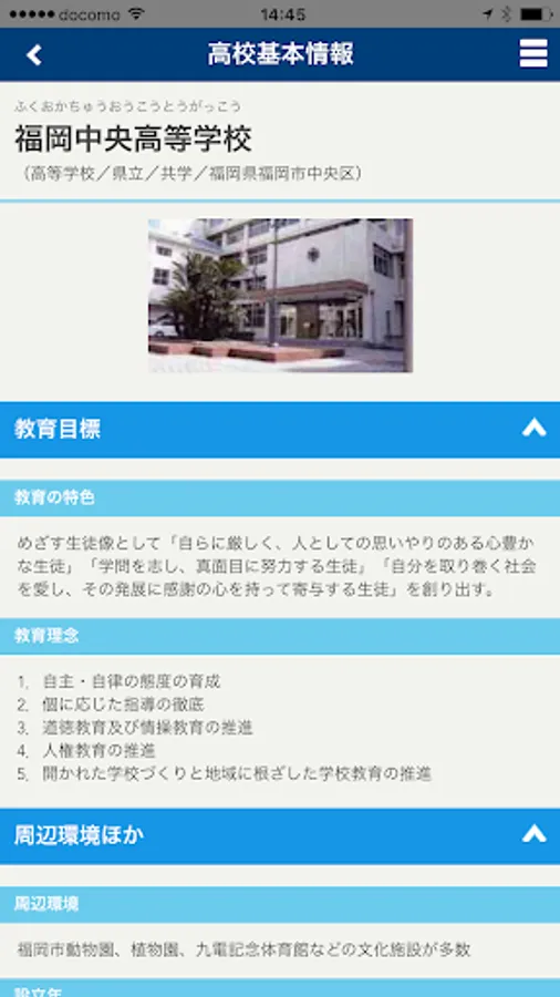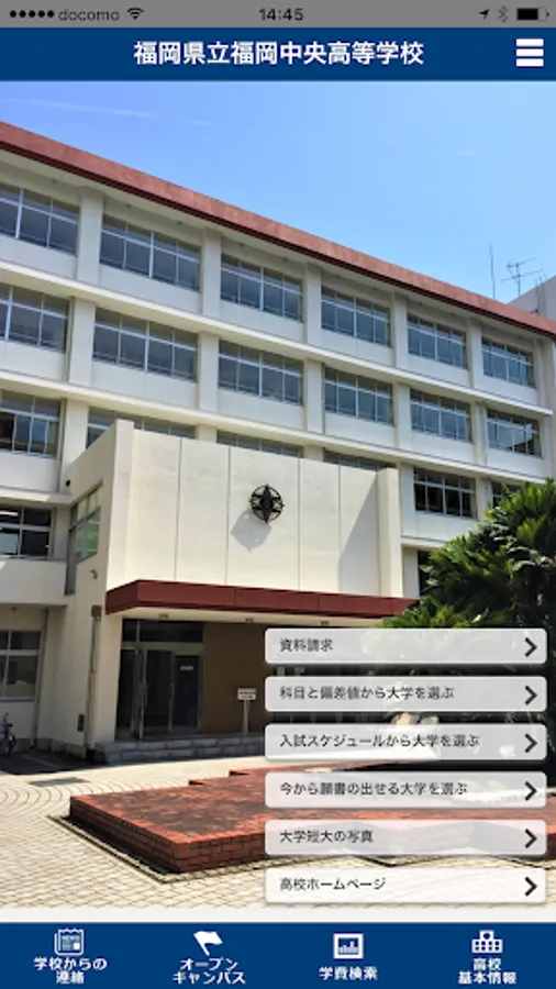 福岡中央高等学校アプリでは、大学受験などに役立つ進学情報(オープンキャンパス情報、学費情報など)や、福岡県立福岡中央高等学校の基本情報(所在地、電話番号など)を掲載しています。