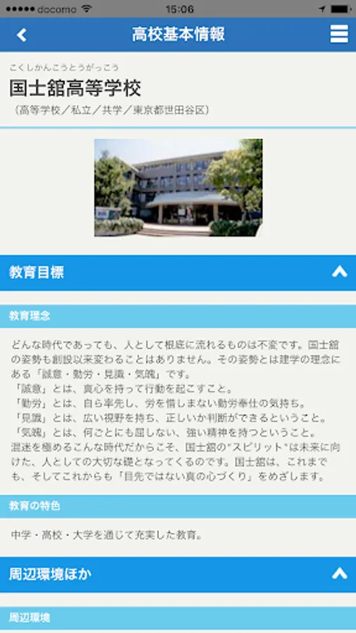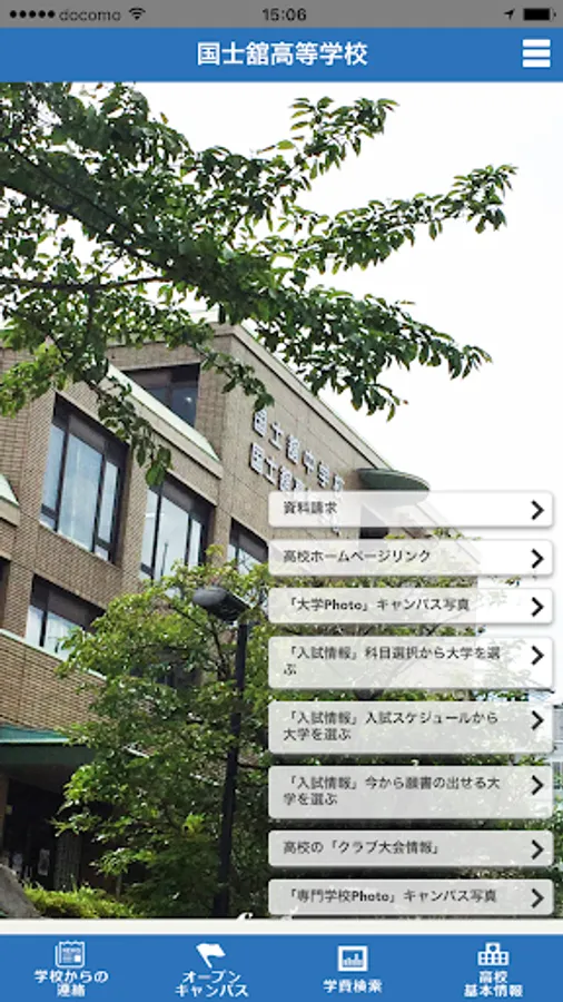 国士舘高アプリでは、大学受験などに役立つ進学情報(オープンキャンパス情報、学費情報など)や、国士舘高等学校の基本情報(所在地、電話番号など)を掲載しています。