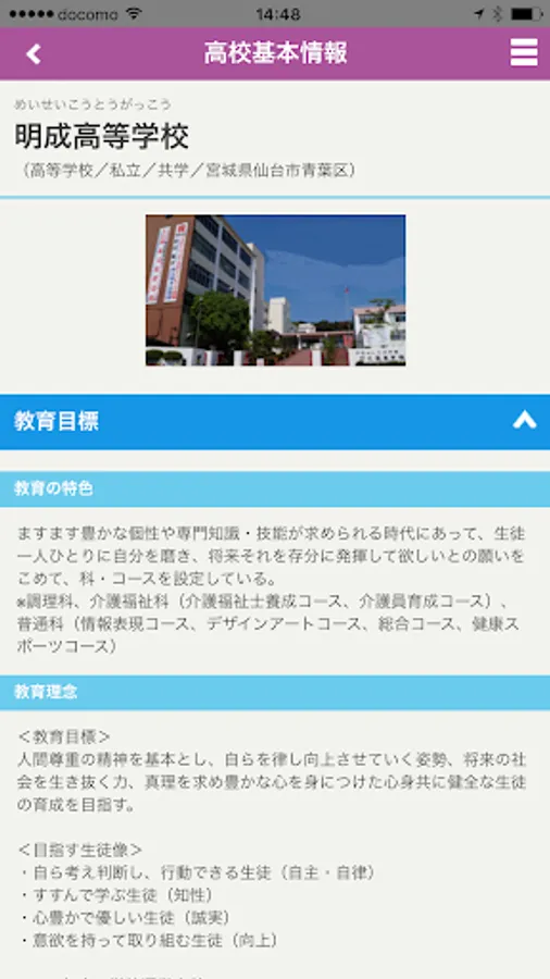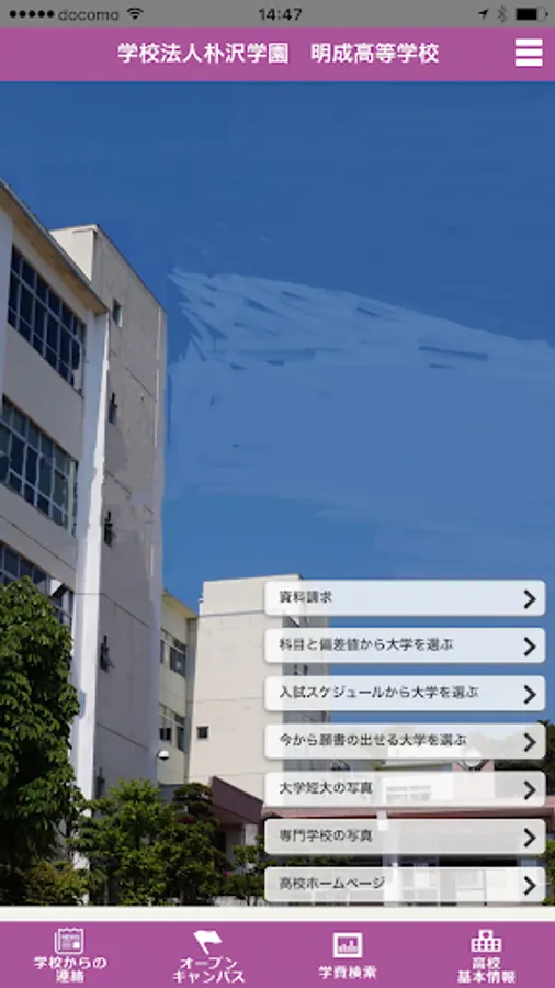 明成高校アプリでは、大学受験などに役立つ進学情報(オープンキャンパス情報、学費情報など)や、学校法人朴沢学園 明成高等学校の基本情報(所在地、電話番号など)を掲載しています。