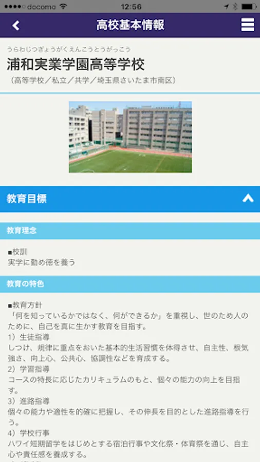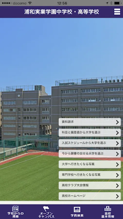 浦実アプリでは、大学受験などに役立つ進学情報(オープンキャンパス情報、学費情報など)や、浦和実業学園中学校・高等学校の基本情報(所在地、電話番号など)を掲載しています。