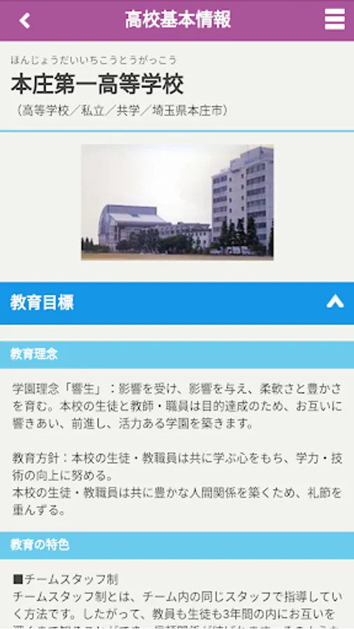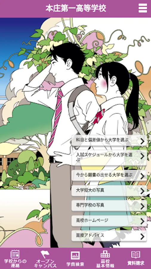 本庄第一高校アプリでは、大学受験などに役立つ進学情報(オープンキャンパス情報、学費情報など)や、本庄第一高等学校の基本情報(所在地、電話番号など)を掲載しています。