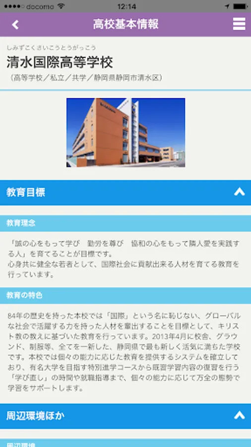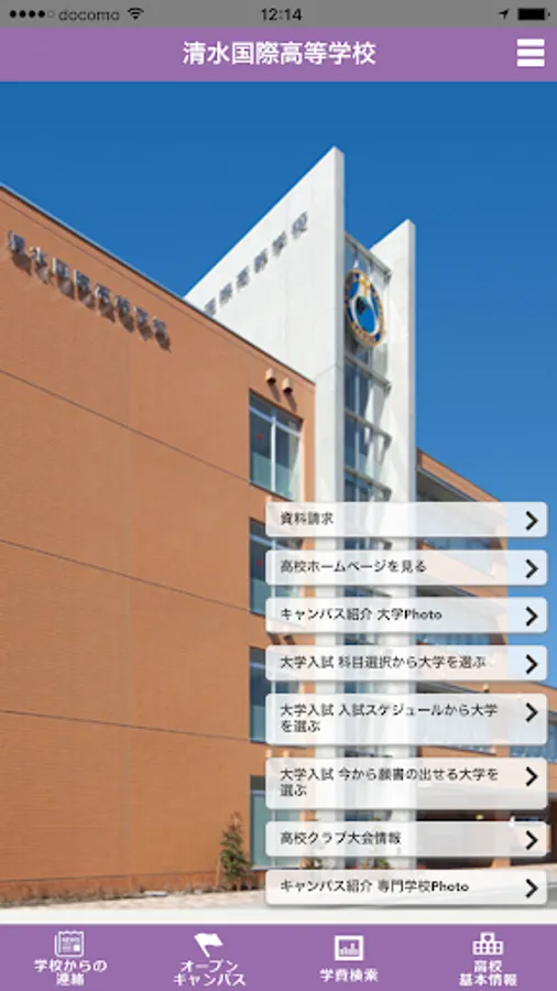 清水国際高等学校アプリでは、大学受験などに役立つ進学情報(オープンキャンパス情報、学費情報など)や、清水国際高等学校の基本情報(所在地、電話番号など)を掲載しています。