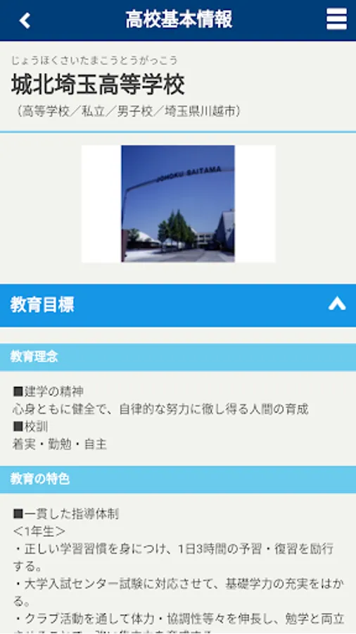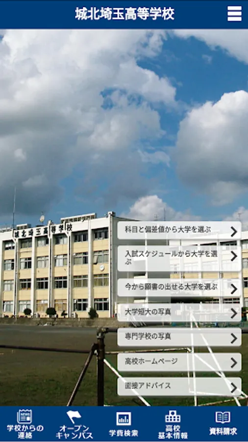 城北埼玉高校アプリでは、大学受験などに役立つ進学情報(オープンキャンパス情報、学費情報など)や、城北埼玉高等学校の基本情報(所在地、電話番号など)を掲載しています。