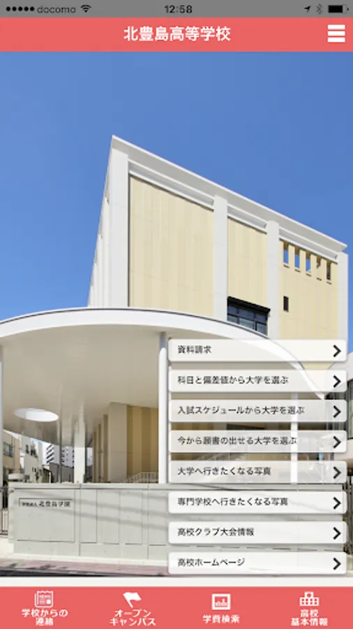 北豊島高校アプリでは、大学受験などに役立つ進学情報(オープンキャンパス情報、学費情報など)や、北豊島高等学校の基本情報(所在地、電話番号など)を掲載しています。
