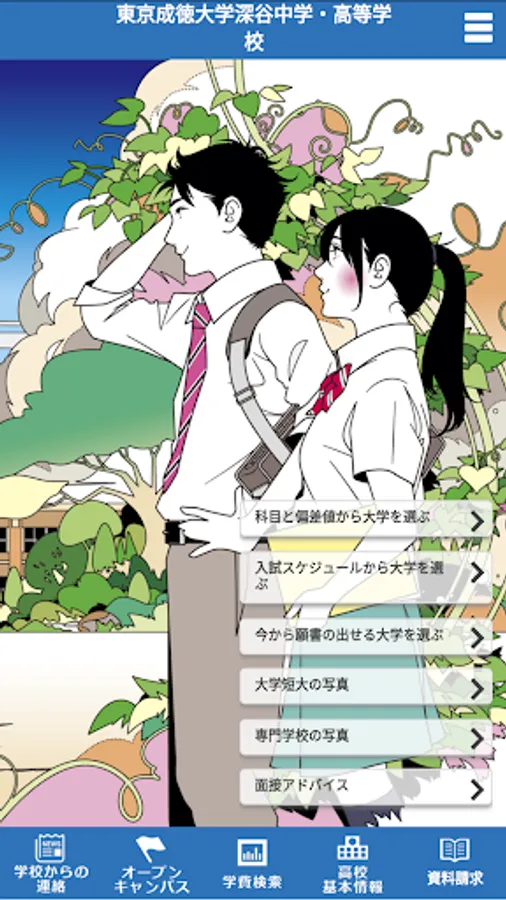 東京成徳深谷アプリでは、大学受験などに役立つ進学情報(オープンキャンパス情報、学費情報など)や、東京成徳大学深谷中学・高等学校の基本情報(所在地、電話番号など)を掲載しています。