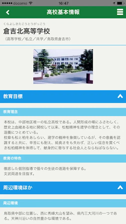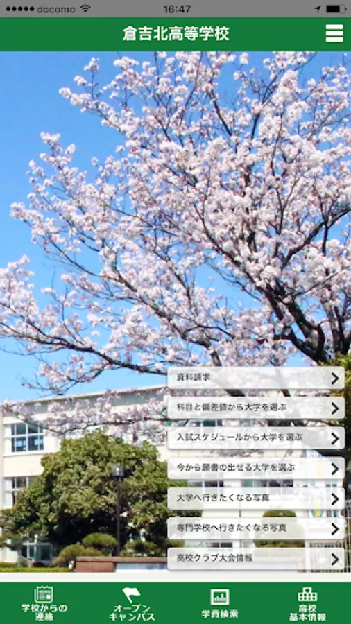 倉吉北アプリでは、大学受験などに役立つ進学情報(オープンキャンパス情報、学費情報など)や、倉吉北高等学校の基本情報(所在地、電話番号など)を掲載しています。