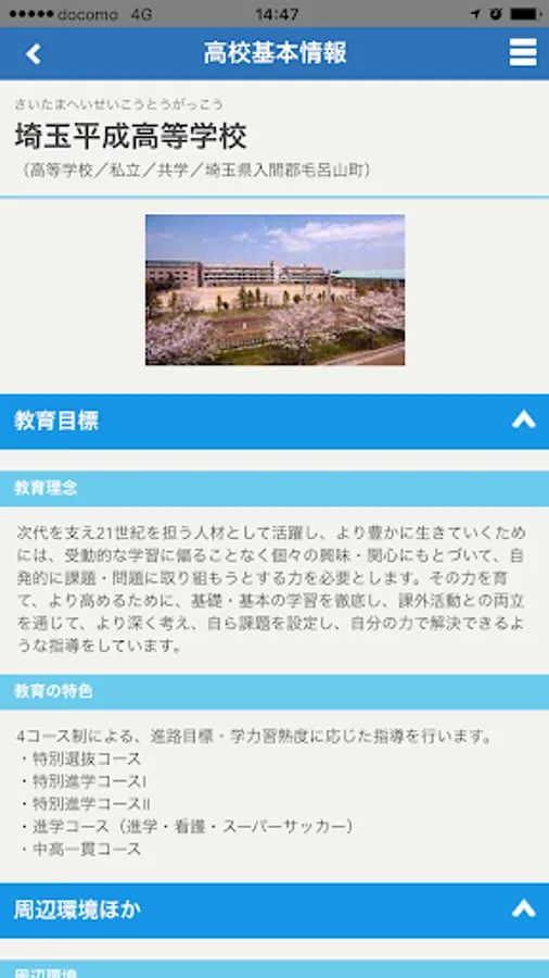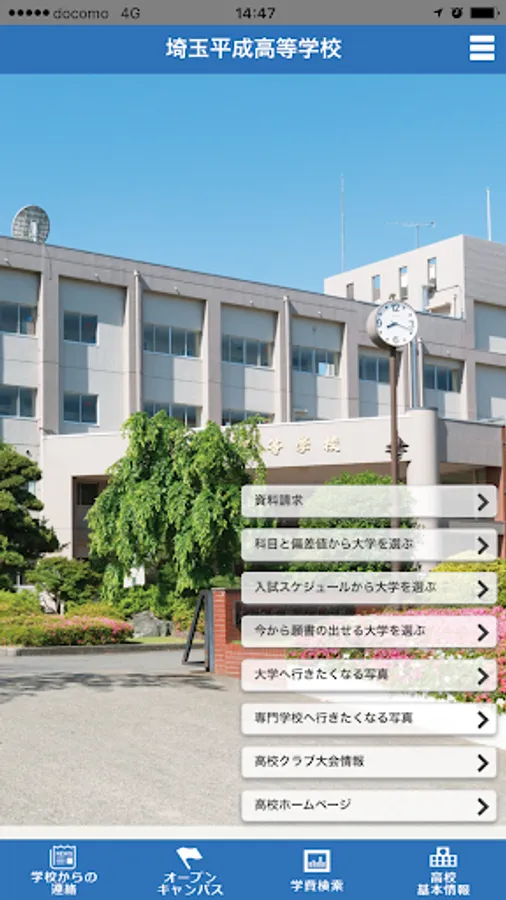 埼玉平成アプリでは、大学受験などに役立つ進学情報(オープンキャンパス情報、学費情報など)や、埼玉平成高等学校の基本情報(所在地、電話番号など)を掲載しています。