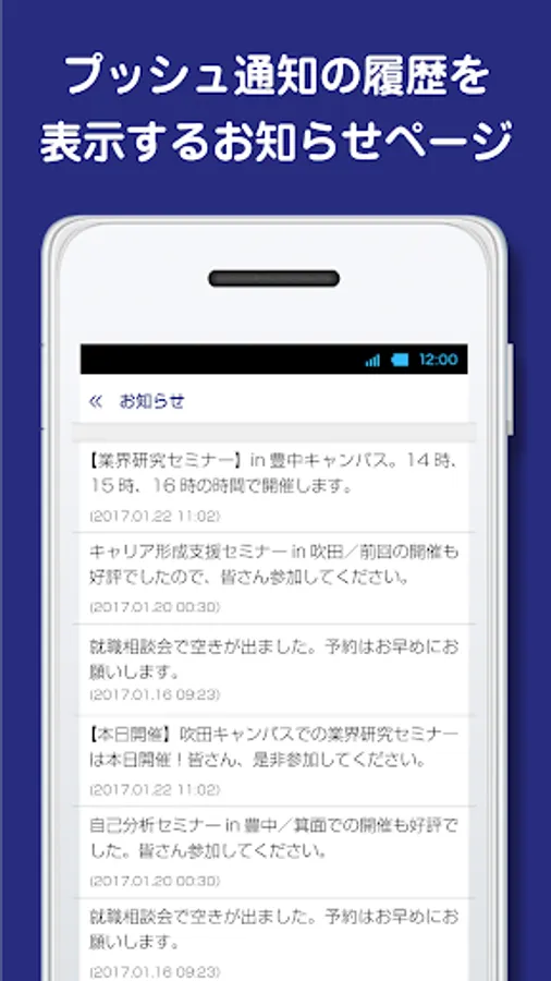 プッシュ通知で配信されたお知らせの履歴を、一覧で見ることができます。