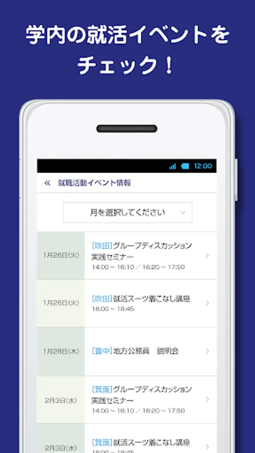 学内で開催される就職活動イベントの情報を掲載。いつ、どこで、どのようなイベントが開催されるかを手軽に確認できます。