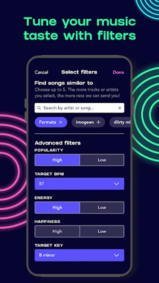- Filter recommendations to find similar songs by artist, genre, BPM and more