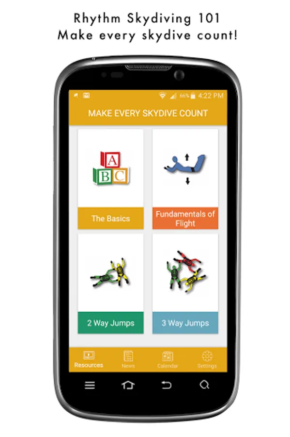 Rhythm Skydiving 101 gives the new skydiver an array of videos, diagrams, flash cards, and other tools covering the fundamentals of the sport. A variety of information and exercises will build your skydiving skills and knowledge both in the air and on the ground. Make every skydive count!