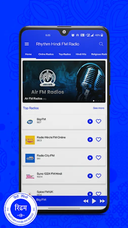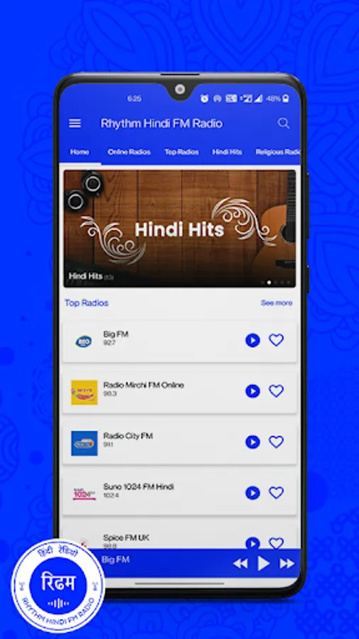 Rhythm Hindi FM Radio Listen Hindi HD Songs Online is the perfect hub for tuning into your favourite latest Hindi Super Hits. Listen to the best new songs on loop or tune into your favourite old melodies as you like. With hundreds of live music and news channels on board, you can collect your favourite stations and access easy playing options in the future.