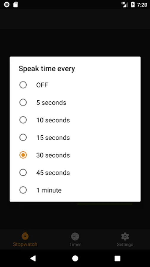 Stopwatch: The app speaks out the elapsed time at the specified interval. Example: "5 seconds", "10 seconds"....1 minute 30 seconds" and so on until stopped.