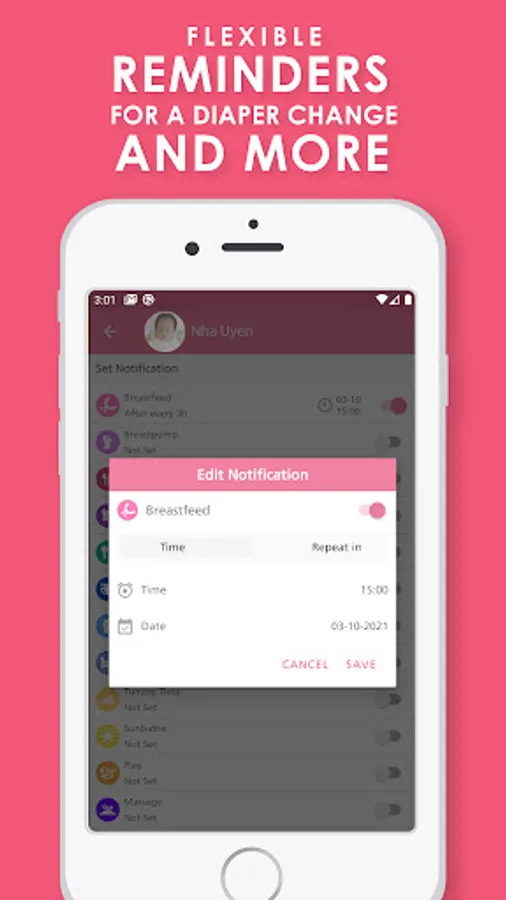 Get reminded when it’s time for a feed, a diaper change, sleep or other activities. You can also choose to set up customized schedule to get notified.