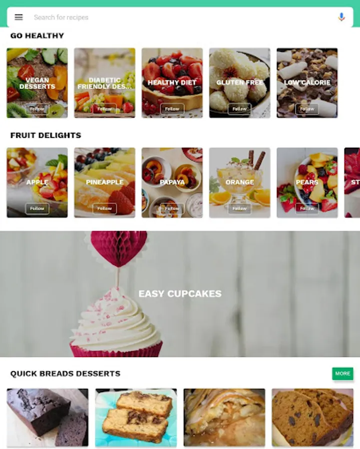 Our healthy desserts recipe app gives you lots of free cooking recipes for pies, cobblers, brownies, etc. Now that you've our dessert recipes app, you no longer need to carry around bulky recipe books.