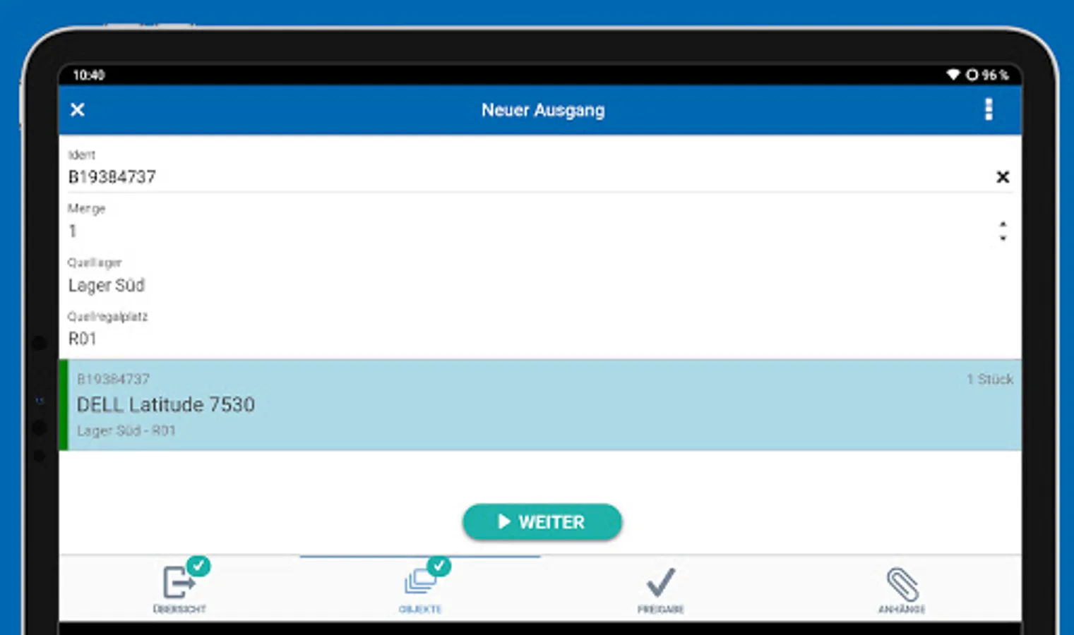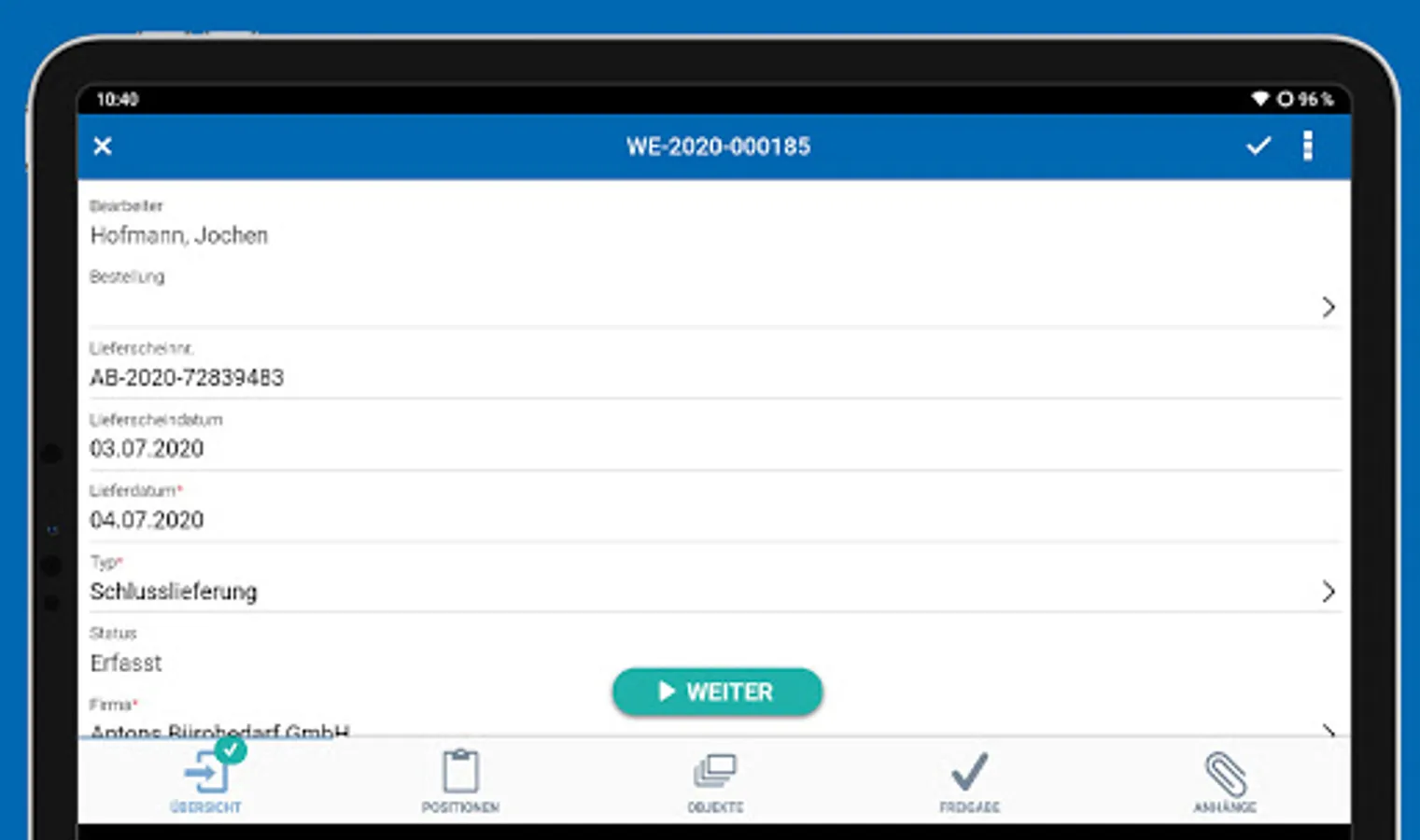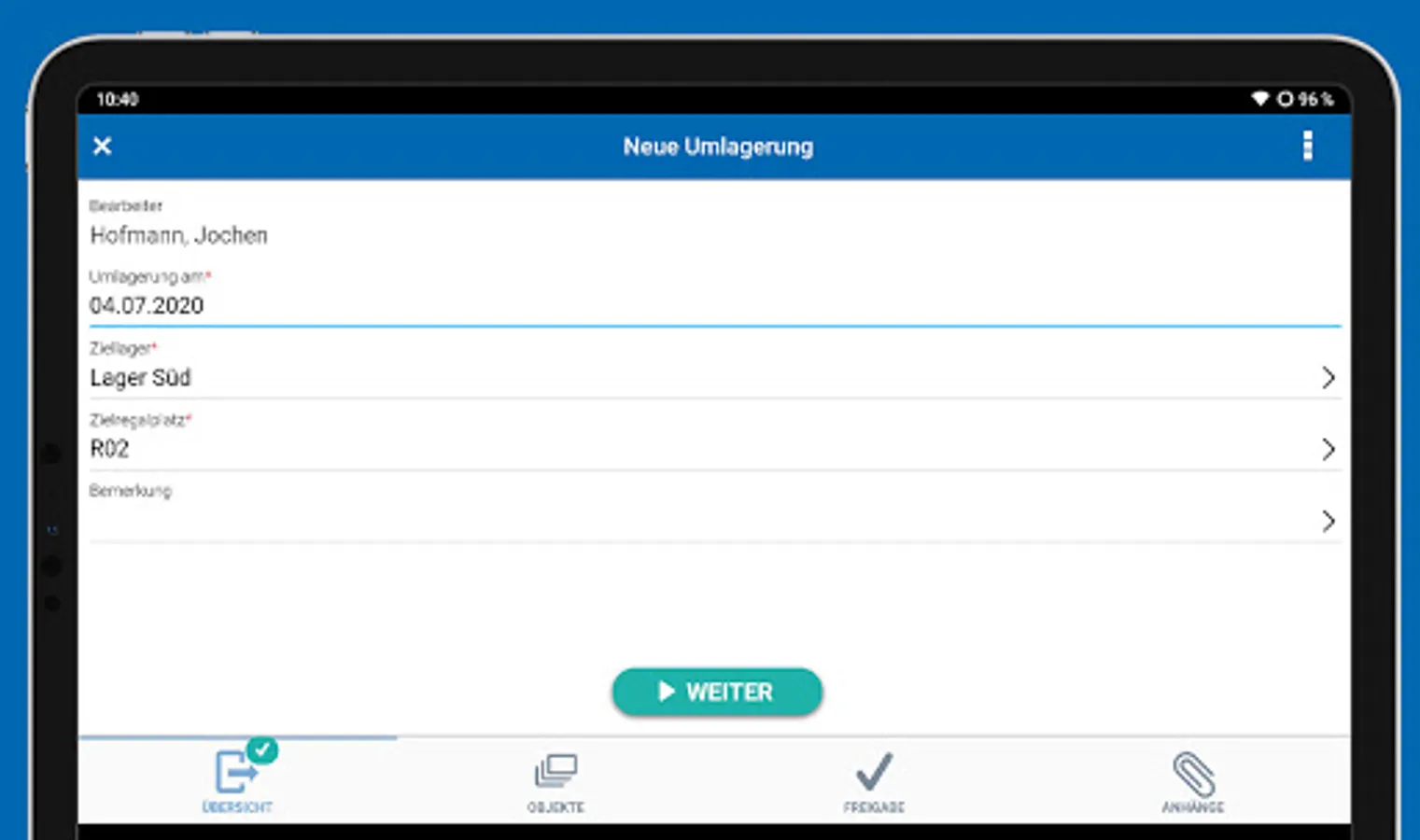 The iTWO fm App Warehouse is the mobile counterpart to the warehouse management in iTWO fm. You can easily manage your stored items (single or bulk items) from anywhere. The Warehouse app offers relevant processes relating to warehouse management and goods traffic directly online. Among other things, the app can be used to book incoming goods, manage quantity and individual items, inventory and store new goods, relocate, issue and take back items. Delivery notes can be stored as photo attachments, paperless receipts can be generated and signed directly in the end device.